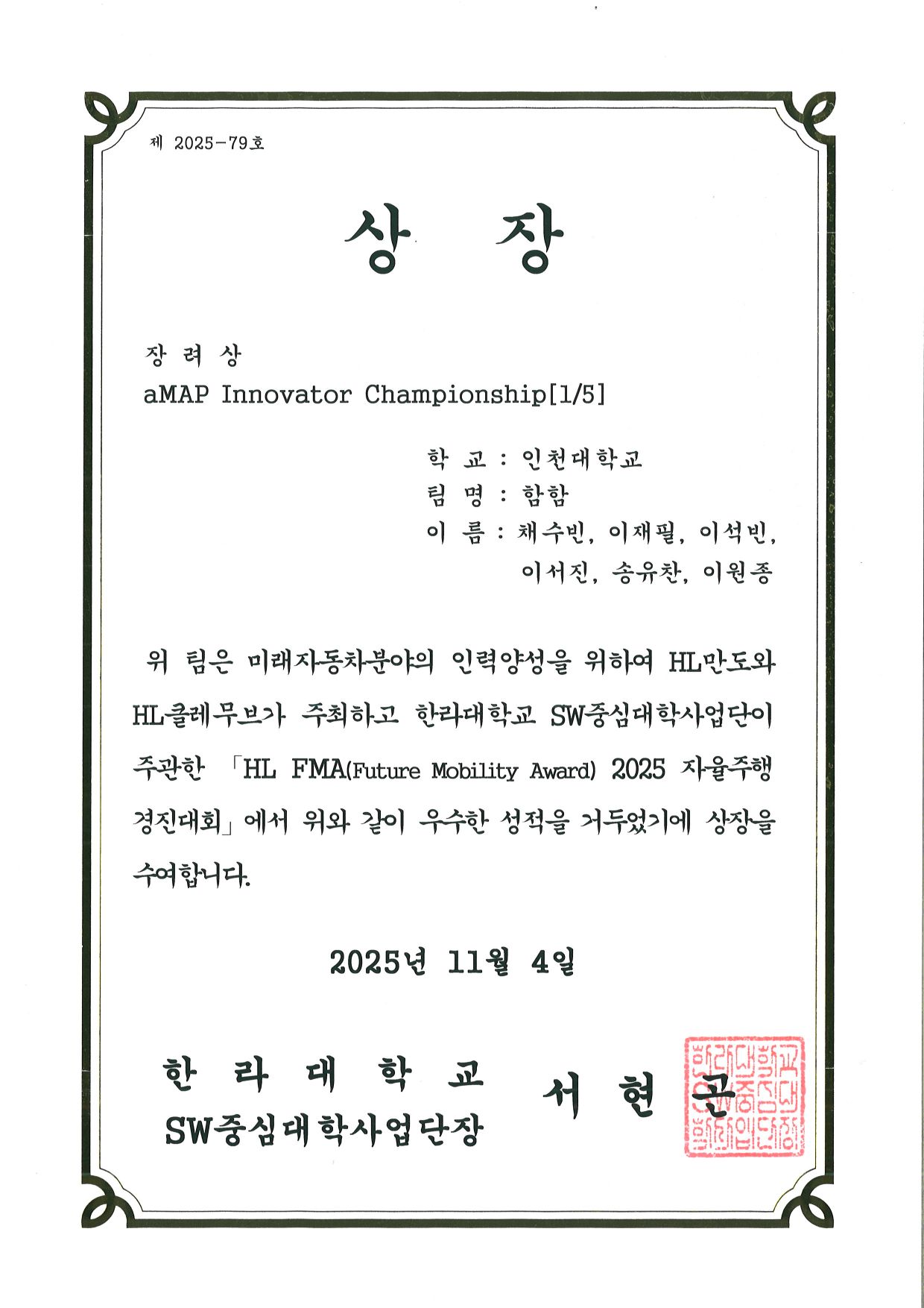 "HL FMA(future mobility awards)2025 자율주행 경진대회"에서 장려상을 수상함.