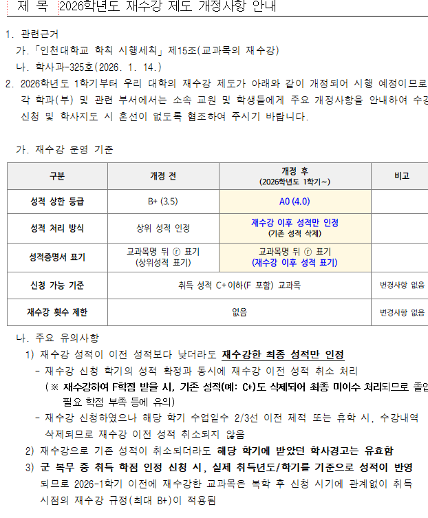 fnctId=bbs,fnctNo=370 재수강제도 변경 안내 글번호 417969 작성일 2026-01-15 수정일 2026-01-15 작성자 임베디드시스템공학과 (032-835-8760) 조회수 230 첨부파일 2026학년도 재수강 제도 개정사항 안내.pdf 관련 규정(개정 전후 대비표).pdf 목록