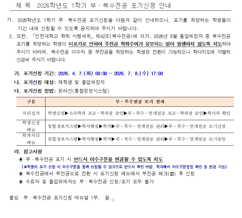 fnctId=bbs,fnctNo=370 2026-1 부복수전공 포기 신청 안내 글번호 421158 작성일 2026-03-16 수정일 2026-03-16 작성자 임베디드시스템공학과 (032-835-8760) 조회수 189 첨부파일 첨부파일이(가) 없습니다. 목록