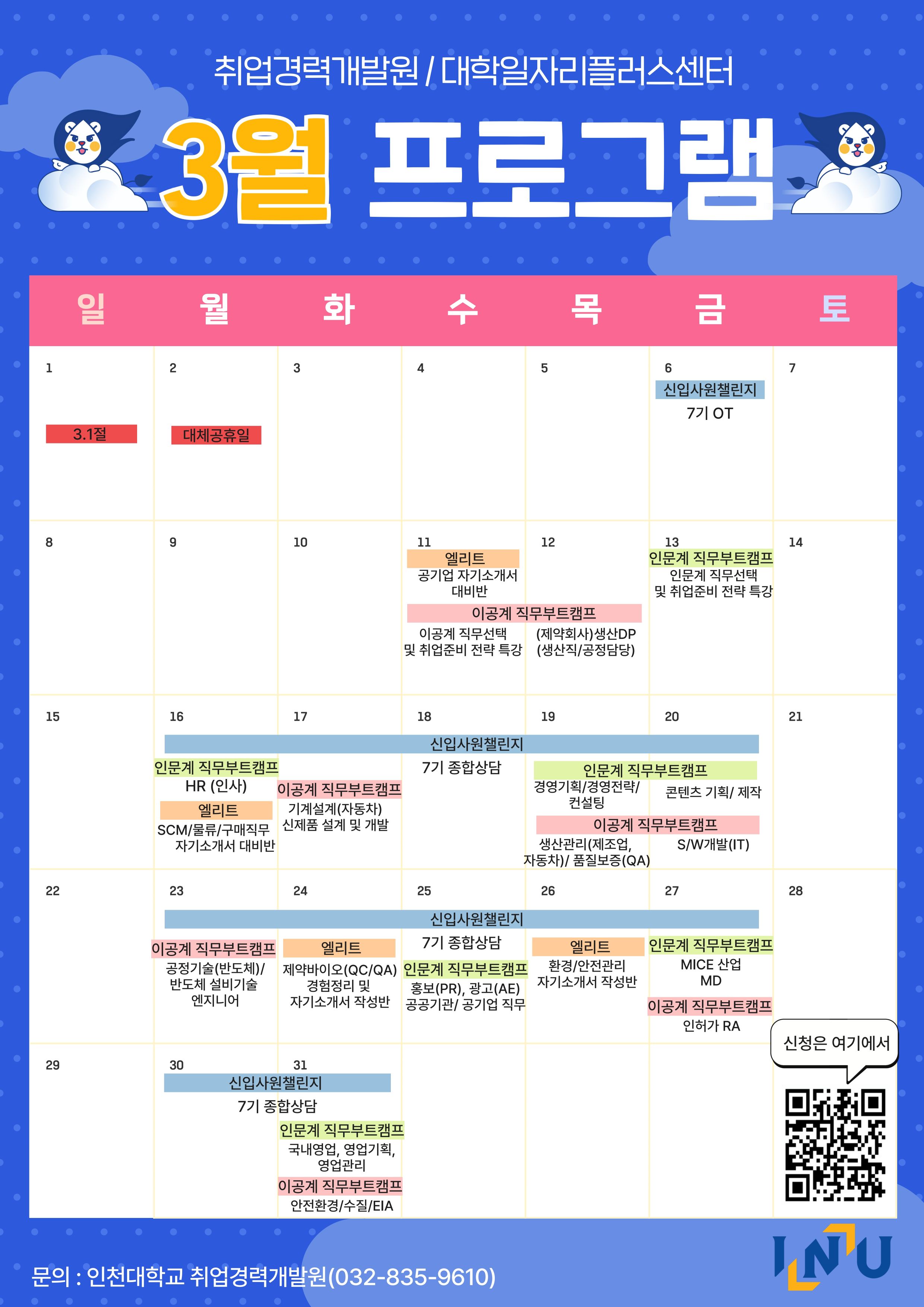 fnctId=bbs,fnctNo=917 26년 3월 진로·취업지원 프로그램 일정표 글번호 420970 작성일 2026-03-10 수정일 2026-03-10 작성자 임베디드시스템공학과 (032-835-8760) 조회수 388 첨부파일 인천대 취업필살기.pdf 다음글 이전글 26년 2월 진로·취업지원 프로그램 일정표 오지은 2026-02-03 16:02:36.0 목록